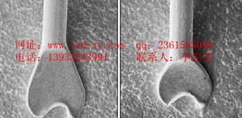 焊线参数调整,主要强调检验:A点位置的结合力、B点位置的金球到金线的光滑过渡和D点金线到焊巴的逐渐过渡如图4所示;而焊线参数优化匹配不当如功率和压力过大等均会造成焊巴过扁过薄而抗拉力不足;如下图所示: